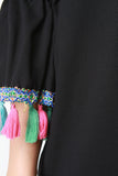 This casual dress features a woven fabrication, off the shoulder neckline, elastic band flare sleeve, flowy shift dress silhouette, with a neon woven trim and colorful neon tassels. finished with a rounded hem. Accessories sold separately. 100% Polyester.