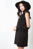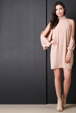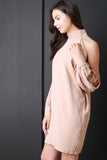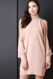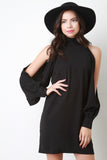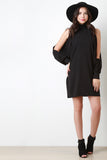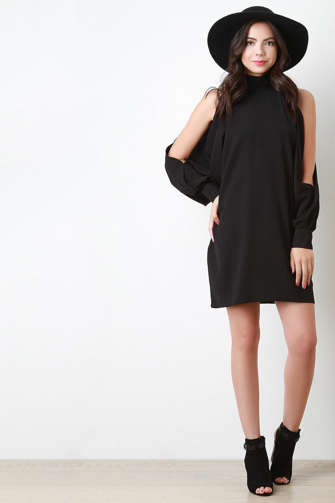 This shift dress features a mock neckline, long sleeves with cold shoulder arm slit construction, and a hidden zipper fastener at back. Accessory sold separately. 97% Polyester, 3% Cotton.