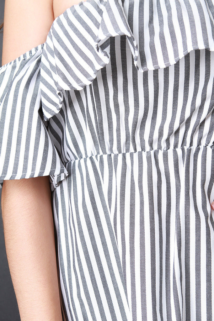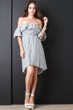 This bardot dress features an elasticized off the shoulder neckline, flutter tier, elastic cinched waist, high low hemline, and contrasting vertical stripes. Made in U.S.A. Accessory sold separately. 100% Cotton.