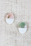 These modern earrings feature a colorblock design, with a faux pearl look, and post backs.