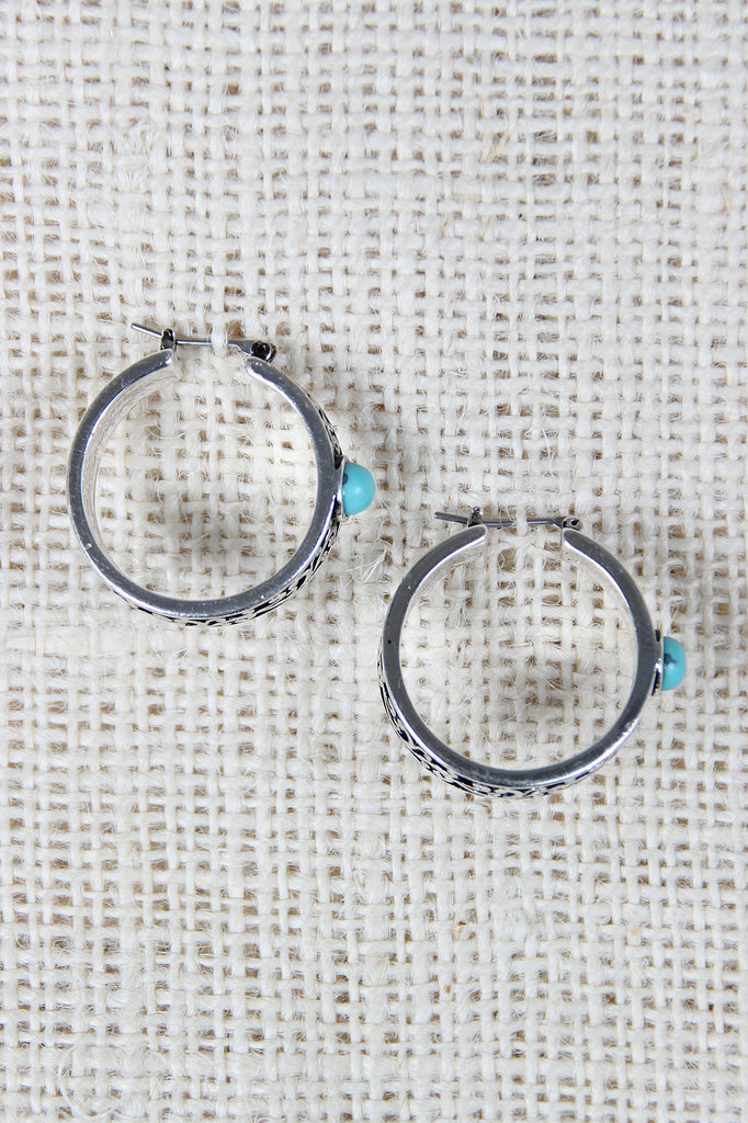 These bohemian inspired hoop earrings feature an engraved filigree design, single turquoise stone detail, and latch closure.