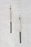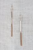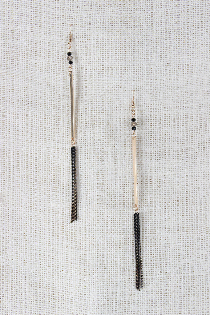 These trendy earring feature a shoulder length design, three beads, metallic bar, finished with a chain tassel and french hook backs.