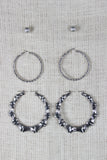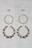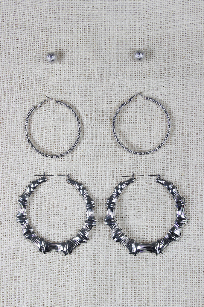 This earring set features three pairs of earrings, one pair of soft finish textured sphere studs, one pair of textured hoops, and one pair of large lined chunky hoops.