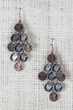 These Greek inspired earrings feature a chandelier dangle style with small multi colored coin like charms attached. Finished with a french hook back.
