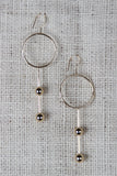 These modern earrings features a high polished metallic finish, open circles with a drop double sphere detail. Finished with french hook backs.
