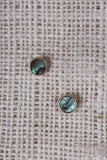 These simple stud earrings feature a circle abalone shell set in a gold tone setting with a post back.