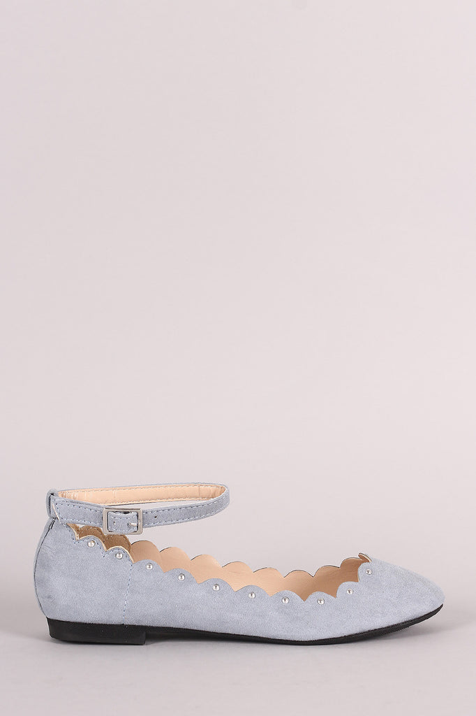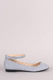 This charming ballet flat features a round toe silhouette, scalloped edge, and adjustable ankle strap with buckle fastening. Finished with lightly padded insole for comfort.