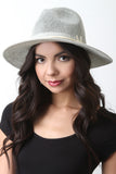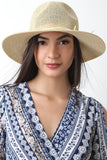 This panama style hat features a straw-like material, wide brim, and a vegan leather cord detail with a knotted tie.