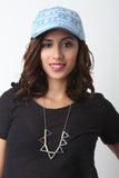 This cap has a classic baseball cap design, featuring 6-panels and curved brim. Adjustable adhesive tape at back. Fabric material. Denim print throughout. Aztec print design along crown.