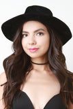 This hat is fedora silhouette, featuring a wide brim and a braided band. Vegan suede fabrication. 35% Cotton. 65% Polyester.