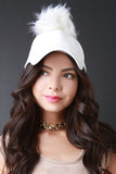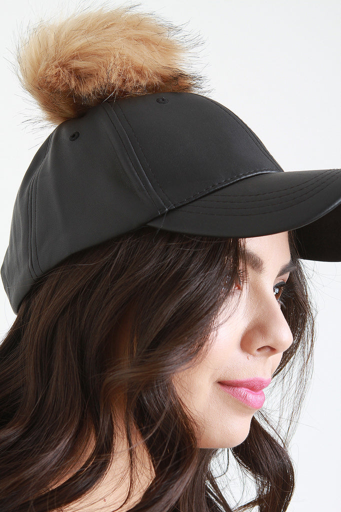 This hat features a classic six panel design, vegan leather fabrication, removable snap on faux fur pom pom and adjustable snap back closure.