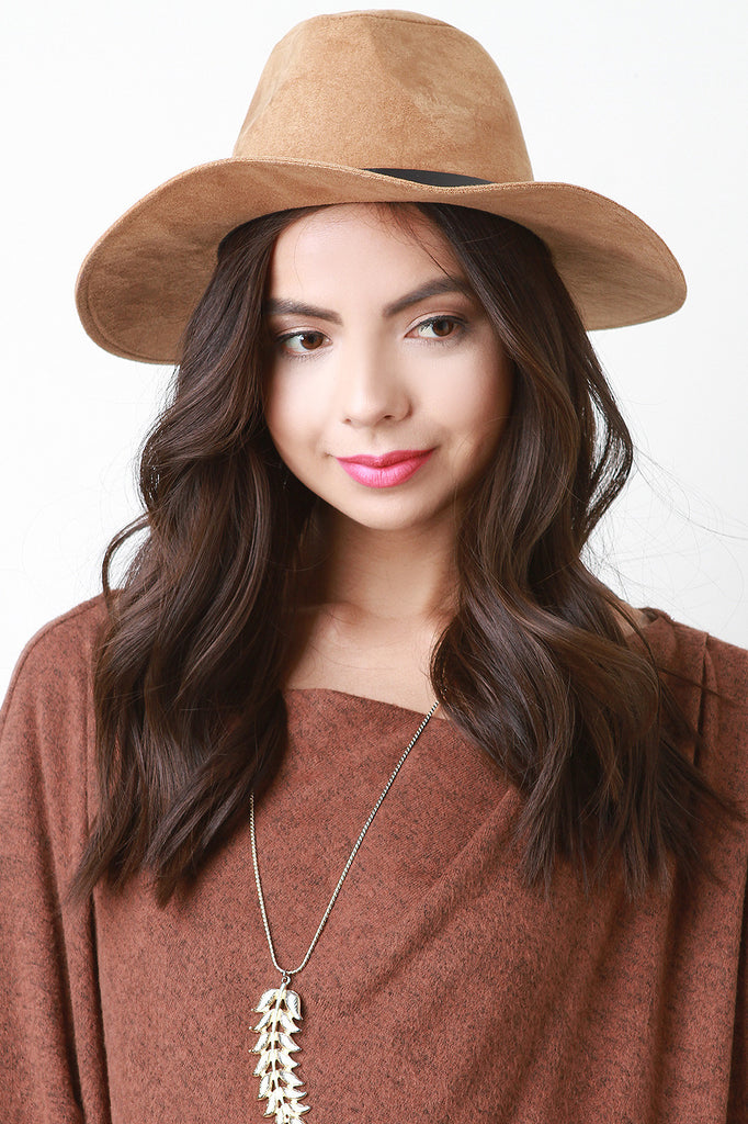 This hat is fedora silhouette; featuring, a pinched crown, wide brim, and a decor belt trim. Finished with an interior ribbon lining. 100% Polyester.