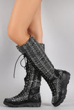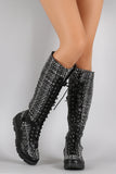 These boots feature a round toe silhouette, tweed fabric upper with vegan leather trims, stitching accents, low heel, and lace up design. Finished with cushioned insole, smooth lining, and partial side zipper closure for easy on/off.