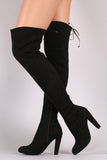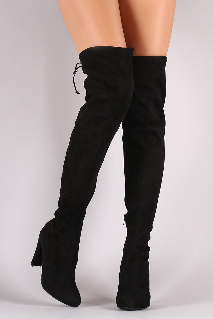 These boots are over the knee silhouette with a slouchy shaft and a self tie string at top opening. Features a small length zipper along the inner side. Almond toe. Finished on a chunky heel.