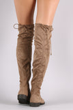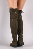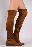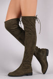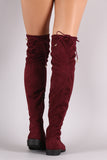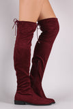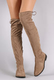 These gorgeous over the knee boots features a slightly stretchy soft vegan suede, low block heel, round toe, and a drawstring collar that ties at the back for custom fit. Finished with a partial side zipper closure for easy on/off.