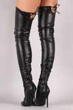 These boots feature a pump silhouette with a stretchy fitted shaft and a keyhole at the back of the knee. Soft lining. Partial inner side zipper. Finished with a pointy toe and on a stiletto heel.