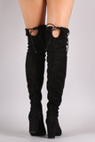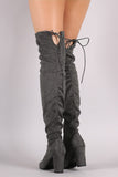 These over the knee boots feature a slightly stretchy vegan suede with an adjustable drawstring ties closure and round toe silhouette. Finished with a cushioned insole, chunky wrapped heel, and pull on construction.