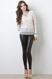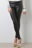L eggings featuring smooth vegan leather, a wide elastic waistband, and stitching detail. Accessories sold separately. Made in U.S.A. 92% Polyester, 8% Spandex.