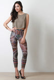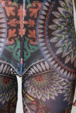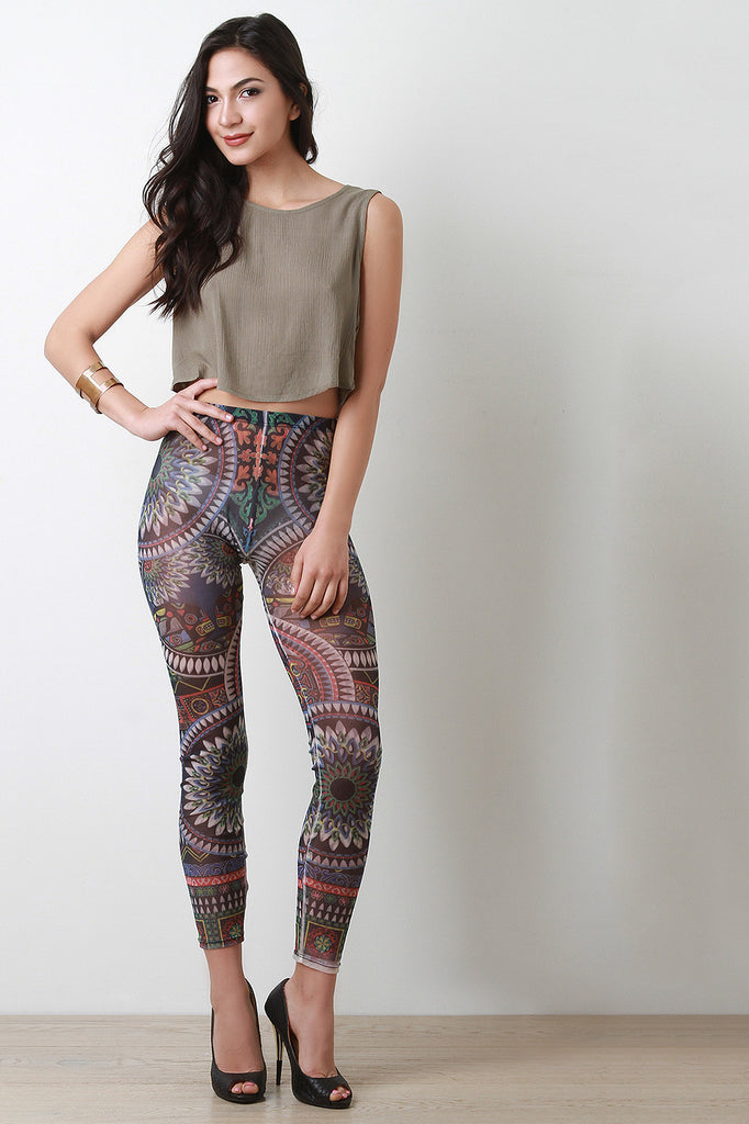 These leggings feature a colorful semi-sheer tribal print throughout, elasticized waistband, and stretchy sculpture fit. Accessories sold separately. Made in U.S.A. 95% Polyester, 5% Spandex.