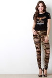 These leggings feature a jersey knit fabrication, camo print, front razor cuts detail, elasticized waist, and taper cut legs. Accessories sold separately. Made in U.S.A. 95% Cotton, 5% Spandex.