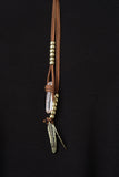 This layered necklace features a metal bar collar with triangle textures, a knotted faux suede cord necklace with crystal stone and feather charms, and beaded accents. Finished with an adjustable lobster hook closure.