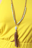 A double-layered long necklace featuring antique-finish curb link chain, faceted acrylic beads, and metallic spacer accents. The pendant consists of a faux marble pebble and a vegan leather tassel interspersed with fine curb link chains. Finished with an adjustable lobster hook closure. Lead, cadmium, and nickel tested.