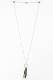 This necklace features a stone spike pendant, a faux leather tassel, and a metallic bar embellishment on a hoop accent. Finished with a fine chain with a lobster hook closure. Lead compliant.