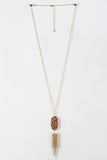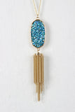 This necklace features a crystal filled oval pendant, with a chandelier style tassel, thin rope chain finished with an adjustable lobster claw closure.