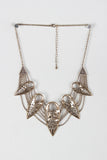 This statement necklace features an edgy design, decorative arrows with cut out designs and a brushed metal finish, multiple chains, finished with an adjustable lobster claw closure and matching earrings.