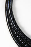 This edgy necklace features three oval shaped omega chains, high polished metal tube charm, matching earrings and an adjustable lobster claw closure.
