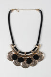 This statement necklace features a woven style cord, felted pom poms and round medallion charm, matching earrings, finished with an adjustable lobster claw closure.
