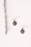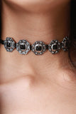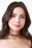 This cute choker necklace features a braided vegan leather fabrication, five decorative buckle charms, matching earrings, and an adjustable lobster claw closure.