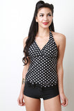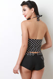 This classic style tankini features a surplice neckline to a self-tie halter neckline, removable soft padded cups, empire waist seam, contrasting polka-dots throughout, and partially lined. Solid color bottom half features boy-shorts cut design, belt loops, high lighted with a wide polka-dot belt sash, and fully lined. Accessories sold separately. 80% Polyester, 20% Spandex. Lining: 100% Polyester.