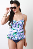 Soak up some sun in this gorgeous tankini set! Featuring rose print, lightly padded sweetheart bust with self-tie sash, adjustable spaghetti straps, ruffle hem, and partial lining. Bikini bottom features solid color main and is finished with lining. Accessories sold separately. Shell: 80% Polyester, 20% Polyurethane. Lining: 100% Polyester.