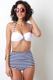 This trendy nautical bikini features a white bandeau bikini top with molded foam cups, removable adjustable striped halter straps, self-tie secure back, and a gold-tone anchor decor at center bustier. Bikini bottom features a high waisted design, elasticized waist, brief bottom, contrasting horizontal stripes, and fully lined. Accessory sold separately. 82% Polyamide, 18% Elastic. Lining: 100% Polyester.