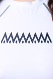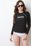 This swimwear rash guard cover-up top features mock neck, long raglan style sleeves, zig zag print at front, and finished with contrast stitching. Accessories sold separately. Shell: 80% Nylon, 20% Spandex.