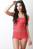 This two piece tankini swimsuit features a retro inspired polka dot pattern, tankini top with wide shoulder straps to a crisscross self-tie back, elasticized ruched sides, empire seam, and removable cup padding. Bottom half features a high rise waist, brief bottom, and side ruffle accent. Accessories sold separately. 80% Nylon, 20% Spandex. Lining: 100% Polyester.