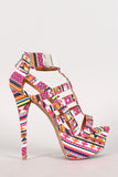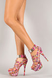 Featuring an open toe front, tribal print fabric throughout with studs accent, metallic band at ankle, wrapped platform, and stiletto heel. Finished with lightly padded insole and rear zipper closure for easy on/off.