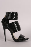 This stiletto heel features a strappy construction with stitched trims, open toe silhouette, lightly padded insole, and tassel back-zip closure.