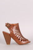This trendy heel features a caged cutout design with side buckle accent, peep toe silhouette, and chunky stacked heel. Finished with lightly padded insole and side zipper closure for easy on/off.