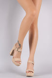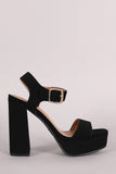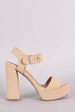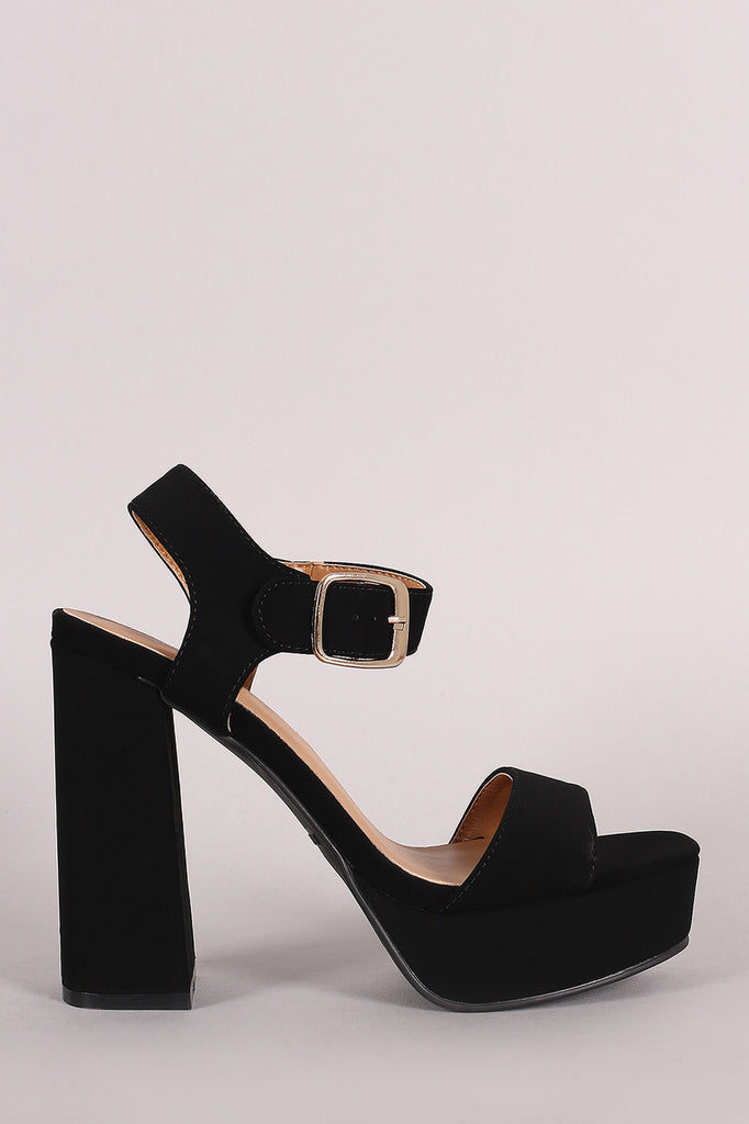 This heel features an ankle strap with adjustable buckle closure, open toe silhouette, chunky heel, and wrapped platform. Finished with lightly padded insole for comfort.