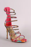 This beautiful heel features multiple rhinestone-encrusted straps across vamp, vibrant floral print throughout, open toe silhouette, and wrapped stiletto heel. Finished with a rear zipper fastener, and lightly padded insole.