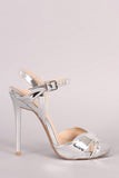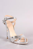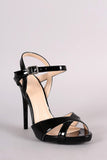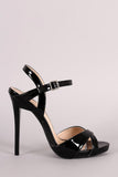 This classic heel features a peep toe silhouette, crisscrossing straps across vamp, slingback ankle strap with side buckle closure, and wrapped stiletto heel. Finished with lightly padded insole.