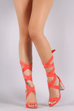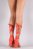 This gorgeous open toe heel features a self-tie lace-up sash design with metallic accent chunky heel. Finished with a lightly padded insole for comfort.