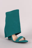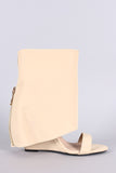 This heel feature a covered boot shaft around the upper ankle area with a decor back zipper. Open toe silhouette. Finished on a wedged heel.
