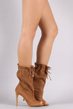 These booties feature a pump design with a slouchy perforated shaft and a lace tie at top line. Finished on a stiletto heel with a peep toe opening.