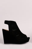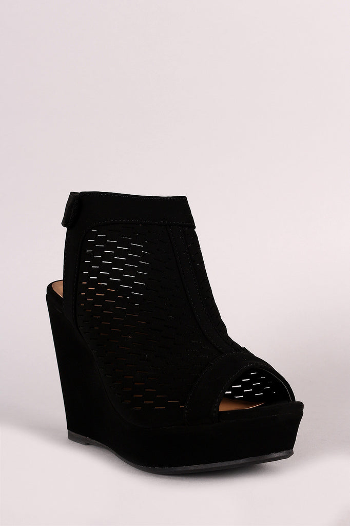 This chic wedge features a nubuck upper, peep toe silhouette, perforated caged construction, and wrapped platform wedge heel. Finished with a loob back adhesive closure strap and lightly cushioned insole.