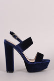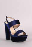 This double band heel features an open toe silhouette, chunky platform, covered thick heel, slingback strap with buckle closure, and lightly padded insole.