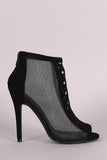 These lovely booties feature a peep toe silhouette, sheer mesh with geometric cutouts design, and wrapped stiletto heel. Finished with a lightly padded insole and rear zipper closure for easy on/off.
