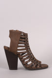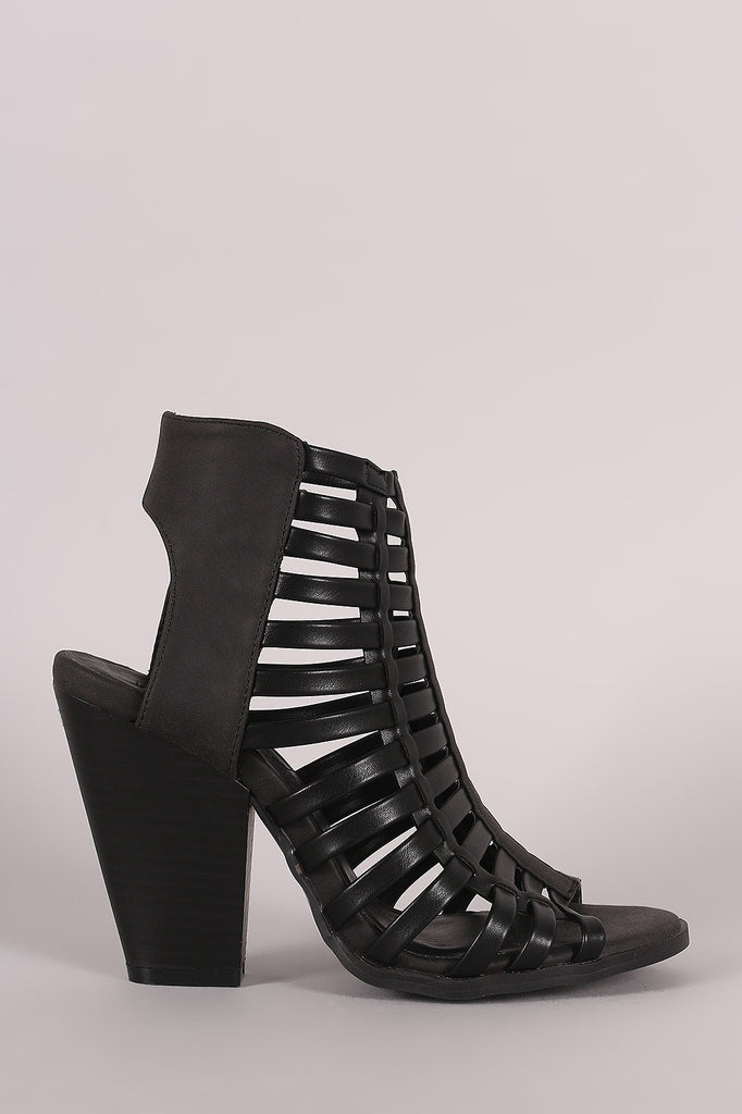 These chunky heel booties feature a strappy cage design with an adjustable inner side zipper. Rear cutout with open toe. Finished on a tapered stacking chunky heel.